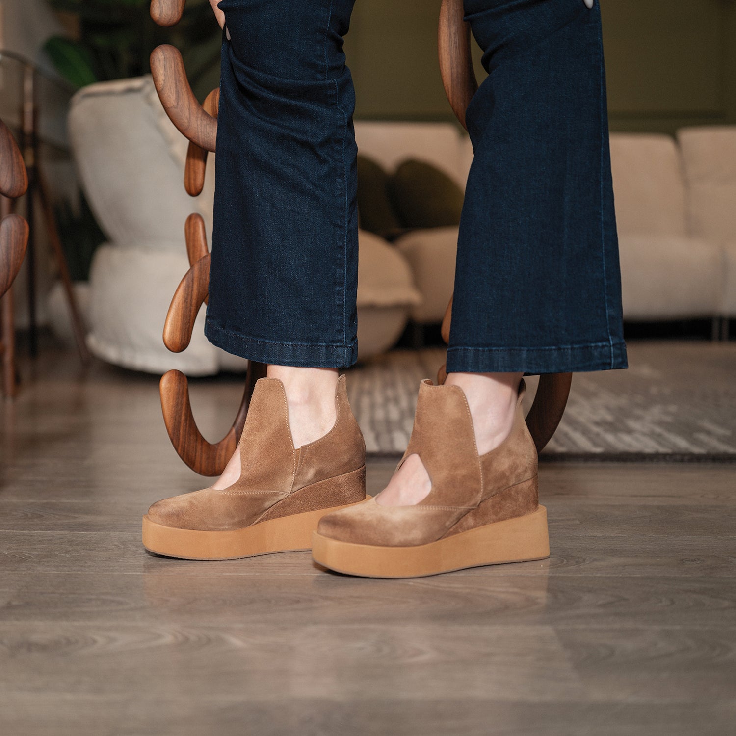 Experience breezy sophistication with these suede platform wedge cutout ankle strap sandals, featuring artistic cutout patterns that create beautiful visual interest while providing refreshing breathability. The premium suede upper showcases strategically placed cutouts that form an eye-catching design, allowing air to circulate freely while maintaining structural support through the secure ankle strap closure. These versatile sandals combine a comfortable platform wedge with intricate cutout detailing, delivering stable elevation perfect for warm-weather occasions when you want both style and ventilation. The adjustable ankle strap ensures a customized fit while the cushioned footbed provides exceptional comfort throughout your day. Perfect for those who appreciate the artistic appeal of cutout designs combined with the security of ankle strap support.